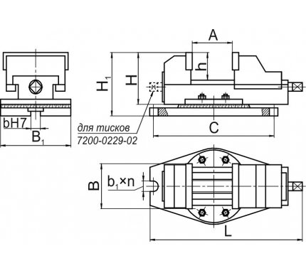 | Модель | / | B | A | B1 | L | H | H1 | h | b | b1 | n | C | S | Усилие зажима, Н | Масса, кг |