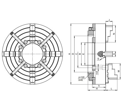 Патрон диаметром 1250 мм с цельными кулачками, класса точности «Н» – 7103-1250Б.